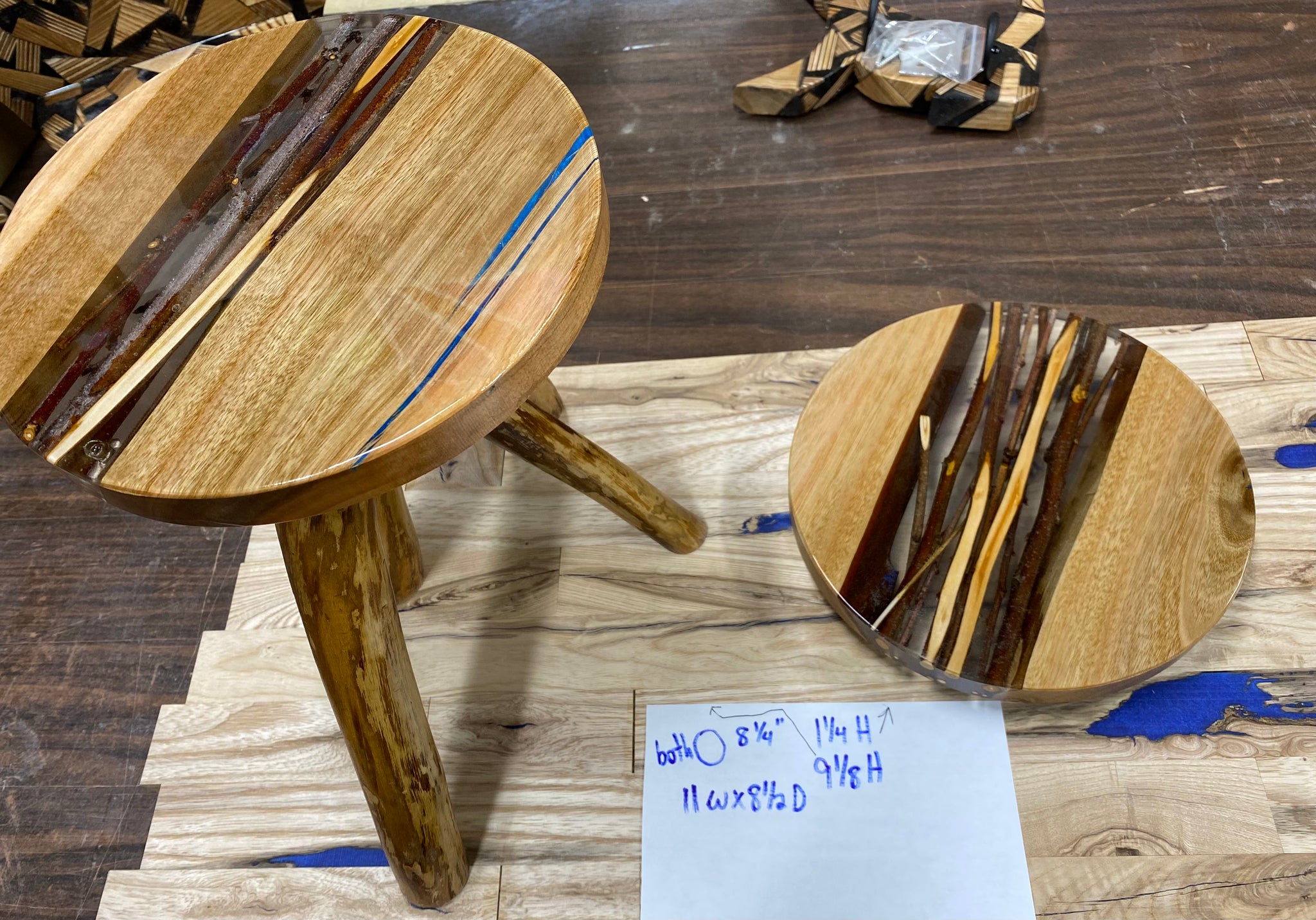 Eucalyptus with fruit tree branches in resin plant stand set, 2 pieces. Contains blue resin accents.
